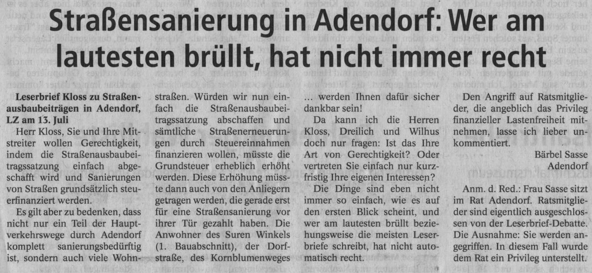 Roland Kloss darf kritisieren, wie seit mehr als 60 Jahren Straßenausbaubeiträge in Niedersachsen und in anderen Bundesländern abgerechnet werden. Er darf auch kritisieren, dass die Straßenausbaubeitragssatzung in Adendorf bisher nicht in seinem Sinne geändert wurde. Ob diese Kritik von Sachkenntnis geprägt ist, ist von untergeordneter Bedeutung. Man darf aber darauf hinweisen, dass die Satzung dem Landesrecht entspricht und bisher von Gerichten nicht grundsätzlich kritisiert worden ist.