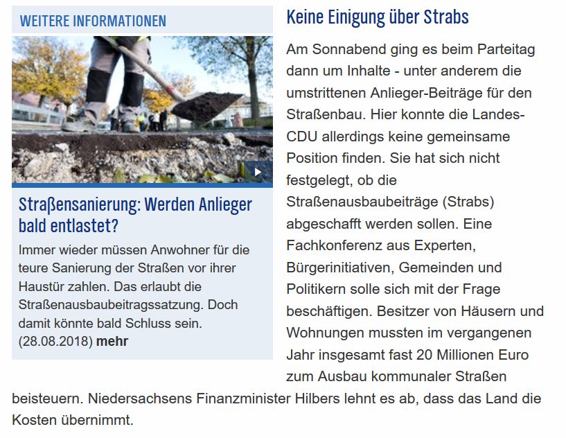 Immer wieder führt die Erhebung von Straßenausbaubeiträgen zu heftigen und schwierigen Diskussionen in vielen Kommunen. Allein in Niedersachsen sind mittlerweile über 30 Bürgerinitiativen aktiv geworden und kämpfen für die Abschaffung der Straßenausbaubeiträge.