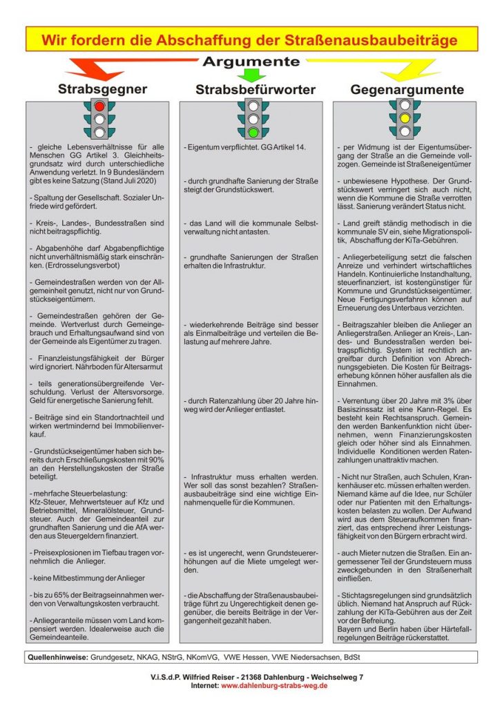 c) Durch ein letztinstanzliches Urteil bzw. einen solchen Gerichtsbeschluss wird nicht unbedingt Gerechtigkeit geschaffen, sondern Rechtsfrieden. Das ist von unserer Verfassung so gewollt und uneingeschränkt zu respektieren. Wir können nicht Rechtsstreitigkeiten über Generationen hinweg führen. d) Auch der Nds. Landtag kann keinesfalls dieses OVG-Urteil als Beleg anführen, dass Straßenausbaubeiträge gerecht seien. Wenn der Nds. Landtag die gesetzlichen Grundlagen für den Erlass von Strabs nicht abschafft, liegt das nicht daran, dass er es wegen entsprechender Gerichtsurteile nicht kann. Es ist allein der fehlende politische Wille. Siehe auch mein Brief an MP Weil und den nachfolgenden Email-Schriftwechsel mit dem Nds. MI. Fazit: Die landesgesetzlichen Ermächtigungsgrundlagen für den Erlass von Straßenausbaubeitragssatzungen in den Städten und Gemeinden in Niedersachsen müssen endlich abgeschafft werden. In Anbetracht der erheblichen Covid-19-bedingten Steuerausfälle in den Kommunen ist zu befürchten, dass die Abschaffung von Strabs erschwert wird und in Kommunen, in denen die Strabs abgeschafft wurde oder nie existiert hat, Gedanken aufkeimen, erneut eine Strabs zu beschließen.