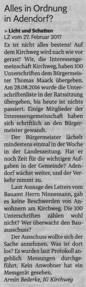 Diese Diskussion im Rat der Gemeinde Adendorf, lässt als Adendorfer, meine Halsschlagader anschwellen. Selbstverständlich wird im „Straßenzug Im Suren Winkel zu schnell und zu unvorsichtig gefahren“, wie es Herr Gunther von Mirbach erklärte und es erübrigt sich meines Erachtens eine Diskussion über die Einführung einer Tempo 30 Zone. Unverständlich ist daher aber auch die Haltung der SPD-Fraktion, die erklärt „eine Temporeduzierung Im Suren Winkel würde den Anwohnern anderer Straßen schaden“. Der Kirchweg und die Dorfstraße sind zeitweise jetzt schon als Durchgangsstraßen voll ausgelastet, oder meint der Herr Ronald Steinberg die Stauffenberg Str. oder den Sandweg, wohl kaum.