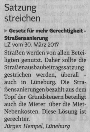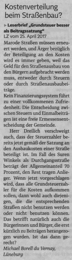 Hätte Herr Borell du Vernay unsere Homepage „www.adendorf-strassen.de“ – wie empfohlen – aufmerksamer studiert, wäre er auf den Abdruck eines Briefes gestoßen, den ich am 22.07.2016 an Frau B. Sasse (Bündnis 90/Die Grünen), Adendorf als Erwiderung auf ihren Leserbrief an die LZ vom 18.07.2016 gerichtet habe. An dieser Stelle habe ich explizit einen Vorschlag unterbreitet, wie man diejenigen Bürger, die in der Vergangenheit durch Straßenausbaukosten belastet wurden, entschädigen könnte.