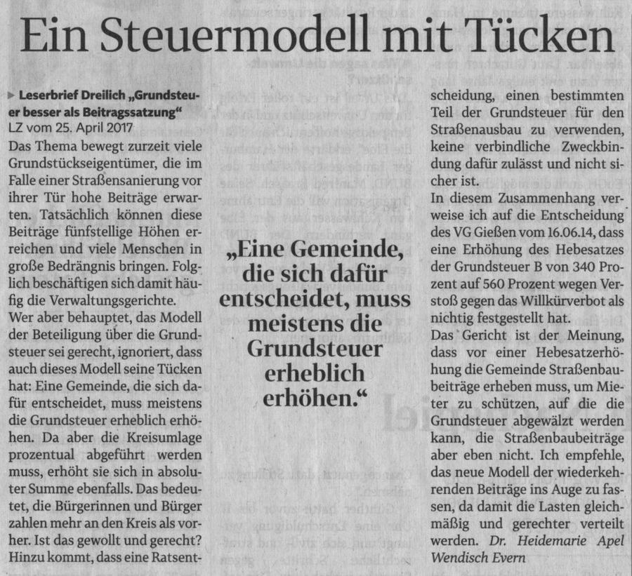 Leserbrief, Antwort auf den Leserbrief „Grundsteuer besser als Beitragssatzung“ vom 25.04.2017:
