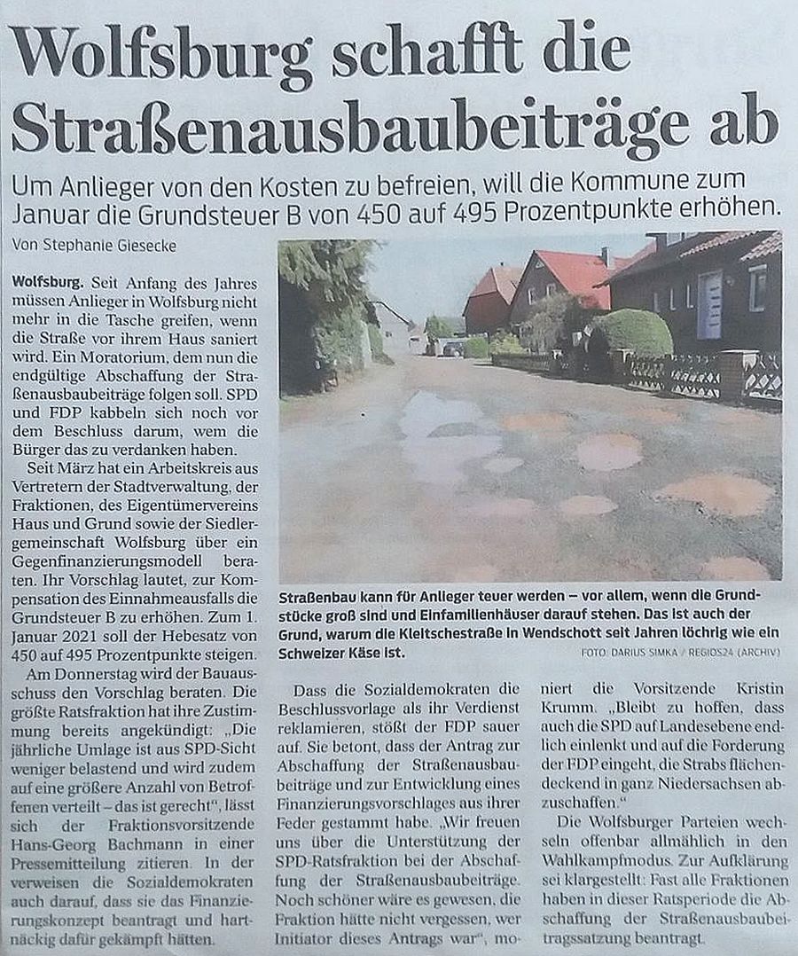 In der Diskussion über die umstrittenen Straßenausbaubeiträge zeichnet sich in Wolfsburg eine Lösung ab. Die Straßenausbaubeiträge sollen abgeschafft und die notwendigen Sanierungsarbeiten durch eine erhöhte Grundsteuer B finanziert werden, teilte die Stadt am Dienstag mit. Eine entsprechende Empfehlung habe ein interfraktioneller Arbeitskreis bestehend aus den Ratsfraktionen, Interessenverbänden wie Haus & Grund sowie der Siedlergemeinschaft Wolfsburg gegeben. (weiterlesen)